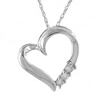Contemporary and classy, this three-stone diamond pendant will touch her heart. Available in your choice of 10 karat white or yellow gold, it features a swooping stylized heart that hangs askew from a delicate 18-inch rope chain finished with a spring ring clasp. Three individual round diamonds, with a total weight of 1/10 carat, are showcased along the lower edge of the heart, held securely in prong settings. With its sweet and simple styling, this is a pretty accent that she can wear and enjoy every day.