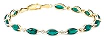 Radiant green created emeralds encircle the wrist in this graceful 10 karat yellow gold bracelet. The faceted marquise emeralds are held in prong settings and arranged in an alternating pattern with polished rhodium dots and a genuine diamond accent (.0045 ct). The look is one of classic beauty and elegance. This bracelet measures 7 1/4 inches and fastens with a simple and secure lobster claw clasp.