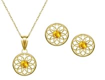 10k Yellow Gold, November Birthstone, Citrine Floral Disc Earring and Pendant Set