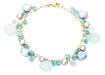 With its beautiful mix of blues, this pearl and gemstone bracelet is destined to attract compliments. Faceted briolettes, hearts, and roundels of blue topaz, chalcedony, and apatite are combined with silver freshwater cultured pearls, in button and potato shapes. The harmonious colors include silver and pale sky blue as well as startling vibrant aqua.The mixed size pearls and gemstones are arranged along a 14 karat yellow gold cable chain that measures 7 1/4 inches and fastens with a lobster claw clasp.