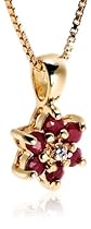 This ruby flower pendant and earring set makes a great gift for someone with a July birthday, or for any woman who loves the rich color of rubies. Beautifully designed in sterling silver with an 18 karat yellow gold overlay, the small floral pendant shines with six prong-set ruby petals surrounding a polished silver center. The rubies have a deep red color with a slight purplish tint. Fixed to a tapered single bale, the pendant slides along an ultra-smooth 18-inch box chain that fastens with a spring ring clasp. The coordinating stud earrings are simple and elegant, with round ruby stones held in four-prong settings and featured on posts with friction back closures.