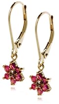 Six petite round rubies frame a single diamond accent in these delicate floral earrings, crafted from genuine sterling silver with an 18 karat yellow gold overlay. The stones have an opaque pink-red color and are held securely in prong settings. The petite flowers dangle from curved posts, and the earrings are secured with comfortable leverback closures. Ruby, the red variety of the mineral corundum, is often given as a symbol of love or passion. This exceptionally durable gemstone is the birthstone for the month of July.