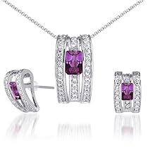 1.75 carats Radiant Cut Amethyst Pendant Earrings Set in Sterling Silver Earrings: Amethyst : 2 pieces, Radiant Cut, 6x4 mm. White Cubic Zirconia: 32 pieces, Round Shape 1.20 mm Dimension : 1/2 x 3/8 inch. Pendant: Amethyst : 1 piece, Radiant Cut, 7x5 mm. White Cubic Zirconia: 42 pieces, Round Shape 1.50 mm Dimension : 7/8 x 3/8 inch. Earrings & Pendant have a total weight of 8.70 grams and are set in pure .925 Sterling Silver. From our Couture Collection, Set features ""one of a kind"" design with a beautiful ""White Gold"" finish featuring Gemstones with a gorgeous deep rich color, vibrant luster and clean clarity. MSRP $126.99 Includes a 18"" Sterling Silver Box Chain, Money Back Guarantee, Signature Gift Box and FREE SHIPPING!!!!!