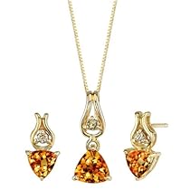 1.50 carats total weight Gemstones. 3 pieces Sparkling Diamonds total weight of 0.07 carats accent the earrings the pendant. Earrings Citrine : 2 pieces, Trillion Cut, 5.00mm. Dimension : 1/4 x 3/8 Pendant Citrine : 1 piece, Trillion Cut, 6.00mm. Dimension : 1/4 x 5/8 Earrings Pendant have a total weight of 1.99 grams and are set in pure 14kt Gold and bears the 14kt stamp. Gemstones have good color and clarity. Retails for over $269.99 Includes a gift Box & Free Shipping. Chain is not included