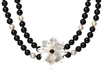 Freshwater Cultured Pearl, Black Agate and Mother-of-Pearl Flower Necklace, 18"